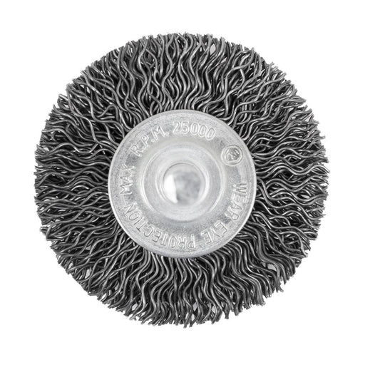 Crimped wire wheel brush. Great for cleaning and blending surfaces, removing light burrs, paint and corrosion. Used for light to medium duty brushi...