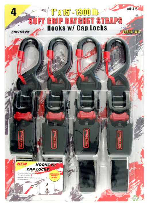 4 Pk. 1" x15' 1300 lb Soft Grip Ratchet Strap w/ Cap Locks. Polyester Webbing Soft Grip Rubber Handle Ratchet 433 Lb. Wll 4" X 1 5/8" Hook Hook Mat...