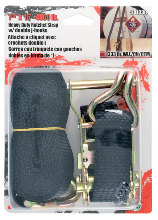 1 1/2"x15' 4000 lb Ratchet Strap w/ double J hooks. Polyester Webbing Chromate Finshed Hardware Wide Handle Ratchet Makes It Easy To Use 1300 Lb. W...