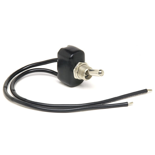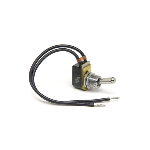 SPST toggle switch, ON-OFF maintained. 10A @ 12V DC. Two wire leads. Nickel-plated brass actuator. Compact, durable design for general purpose use.