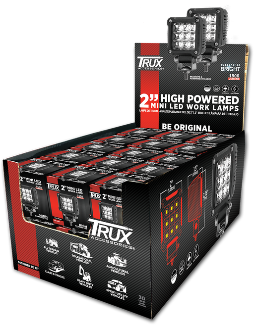 Trux TLED-U104 Retail Display Box with 30 x TLED-U104 1500 Raw Lumens Spot Beam. 2" Cube. 3 year warranty. IP67 Rating.