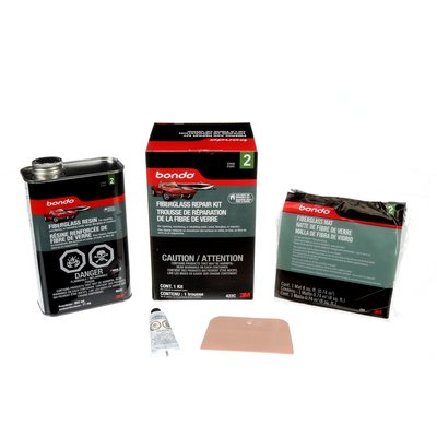Bondo® Fiberglass Repair Kit includes: 852 mL (29 oz) fiberglass resin, 11 mL (0.4 oz) liquid hardener, plastic spreader, and fiberglass mat.
