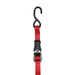 1” X 15’ COMMERCIAL GRADE S-HOOK RATCHET TIE-DOWN. PARTNo. XR015-1P. Designed to secure cargo up to 500 lbs. Chromate-coated steel ratchet buckle with molded handle. 1” highly durable red polyester webbing. Full size vinyl coated steel S-Hook on each end. 8” fixed end.