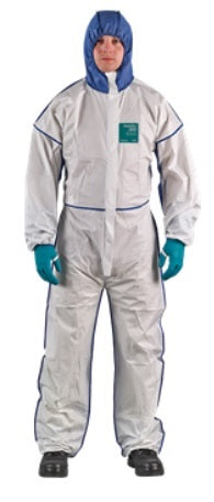 View full detailsAnsell WN18-B-92-195-06 White/Blue Coveralls Size: XXL. AlphaTec® 1800 COMFORT Bound - Model 195 Chemical Protective Suit. DESIGN FEATURES: Coverall, 3-piece hood, navy blue binding with SMS hood, full back and leg panels. Elasticated hood,