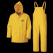 This 3-piece set includes a rain jacket, detachable hood, and bib pant made of PVC/polyester material, offering 100% waterproof and windproof protection. The heavy-duty raincoat has 2 large cargo pockets, vented back and underarms, a zipper/snap storm placket, and a corduroy collar. The bib pants have an adjustable waist and suspenders and snap fly access. This rain gear set comes in sizes small to 5XL. Its bright yellow color offers high visibility in all types of weather. . 3 pieces: jacket, detachable hood and bib pant. .35 mm PVC/polyester/PVC. 100% waterproof and windproof. Jacket: vented back and underarms, 2 large front cargo pockets, zipper plus snap storm placket, welded seams, corduroy collar, detachable hood, embroidery access zipper. Bib pant: adjustable waist and suspenders, snap fly access