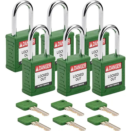 MPN: 99552 Padlocks feature lightweight, nonconductive fiberglass-reinforced nylon bodies, hardened steel shackles and tamper-resistant 6-pin cylin...