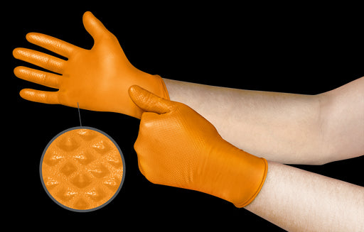 Nitrile Diamond Text. 7 Mil Orange 50/Box Sz.X-Large. orange heavy duty 7 mil thick nitrile. Diamond raised texture. orange heavy duty 7 mil thick ...
