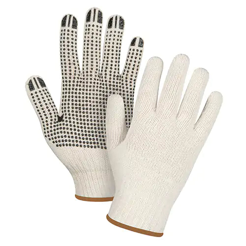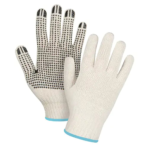 PVC dots provide excellent grip and abrasion resistance Bleached white poly/cotton seamless string knit provides a cool comfortable fit Ambidextro...