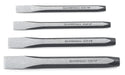 4 Pc. Cold Chisel Set. Designed To Cut Metal Such as Wrought Iron, Steel, Brass, And Aluminum. For Cutting Rivets, Bolts, and Nuts. Softened and Tapered Striking end reduces potential to chip. Ground surface for ease of identification. Precision Harded working ends.