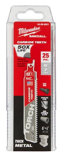 7-TPI TORCH™ SAWZALL Blade with Carbide Teeth 25-Pack. The Milwaukee 48-00-8501 6″ 7-TPI TORCH™ SAWZALL Blade with Carbide Teeth 25-Pack: Features:...