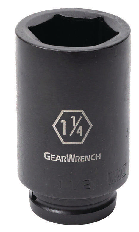 1/2" Drive 6 Point Deep Impact SAE Socket 1-1/4". Chrome Molybdenum Alloy Steel (Cr-Mo) for Exceptional Strength and Durability. Off-Corner Loading...