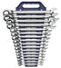 16 Pc. 12 Point Reversible Ratcheting Combination Metric Wrench Set. 15° Offset Offers Increased Clearance. Flush Mounted Reversing Lever Improves Access. 72 Teeth Ratcheting Box End Needs As Little As 5° to Move Fasteners Versus 30° for Standard Box End Wrenches. Off-Corner Loading Design on Box End for Better Grip and Reduced Fastener Rounding. .