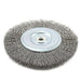 Crimped wire wheel brush. Great for cleaning and blending surfaces, removing light burrs, paint and corrosion. Specifications: Diameter: 6". Arbor: 1/2" - 5/8". Wire Size: .012" (.304 mm). RPM: 6,000.