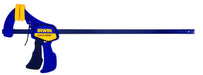 Irwin Quick-Grip One-Handed Mini Bar Clamp, 12". 12" max. jaw opening, 2 7/16" throat depth. Quick-release trigger allows for one-handed use. Soft, durable pads won't mark work. High-tech resin construction is strong yet lightweight, smaller for tight workspaces. Positive locking action holds work tight. Mini Bar Clamp, with a 12-inch maximum jaw opening and 2-7/16-inch throat depth, is excellent for smaller projects, especially in confined workspaces. Clamp features quick-release trigger that allows for one-hand use, soft, durable pads that won't mar work, positive locking action that holds work tight, and is made of high-tech resin construction making it strong, yet lightweight. Irwin tools are made of only the finest materials, manufactured to exacting tolerances.