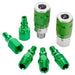 ColorConnex is a patented system that allows colour-to-colour matching of couplers and plugs among the standard pneumatic interchanges. ARO (Type B): Green. By using ColorConnex to dedicate line use, you can ensure you never use a lubricated line for a dry line application, preventing cross contamination. Made from steel/6061-T6 Aircraft Aluminum. Includes: (Qty. 1) FNPT coupler, (qty. 1) MNPT coupler, (qty. 2) FNPT Plugs, and (qty. 3) MNPT Plugs