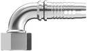 Hydraulic Fitting: Uni-Crimp. O-Ring Face Seal. Female. w/Swivel. 90 Degree Elbow. Hose Dash Size: 4. Thread Dash Size: 4. Hose ID: 1/4. Thread Size: 9/16-18.