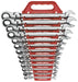 13 Pc. 12 Point Flex Head Ratcheting Combination SAE Wrench Set. Flexible Head. Knurled Side Beam for Ratcheting Direction Indicator. 72 Teeth Ratcheting Box End Needs As Little As 5° to Move Fasteners Versus 30° for Standard Box End Wrenches. Off-Corner Loading Design on Box End for Better Grip and Reduced Fastener Rounding. .