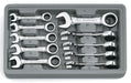 10 Pc. 12 Point Stubby Ratcheting Combination Metric Wrench Set. Ratcheting Box End Needs As Little As 5° to Move Fasteners vs. 30° for Standard Wrenches. Bright, Full Polish Chrome Finish. The Original Patented Ratcheting Wrench. Off-Corner Loading Design on Box End for Better Grip and Reduced Fastener Rounding. Stubby Length for Tight Access Areas.