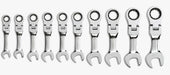 10 Pc. 12 Point Stubby Flex Head Ratcheting Combination Metric Wrench Set. Stubby Length for Tight Access Areas. Flexible Head. Knurled Side Beam for Ratcheting Direction Indicator. 72 Teeth Ratcheting Box End Needs As Little As 5° to Move Fasteners Versus 30° for Standard Box End Wrenches. Off-Corner Loading Design on Box End for Better Grip and Reduced Fastener Rounding.
