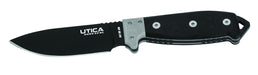Fixed blade with 4" black powder coated 1095 carbon steel blade. 5.5" black micarta handle. Includes kydex sheath with paracord, knife sharpener and fire starter.