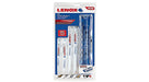 LENOX GENERAL PURPOSE RECIPROCATING SAW BLADE KIT, 9 PIECE. POWER BLAST TECHNOLOGY™ INCREASES BLADE LIFE. High speed blasting along the cutting edge strengthens the blade to reduce breaks and increase durability. LONGER BLADE LIFE & INCREASED VERSATILITY. Patented T2™ Technology reduces cutting forces on each tooth and optimizes chip removal to allow efficient cutting in the widest range of materials. Contains: 2 of 656R – 6tpi 6 x 3/4 x .050. 2 of 624R – 24tpi 6 x 3/4 x .035. 2 of 818R – 18tpi 8 x 3/4 x .035. 2 of 810R – 10tpi 8 x 3/4 x .050. 1 of 960R – 10tpi 9 x 7/8 x .062 .